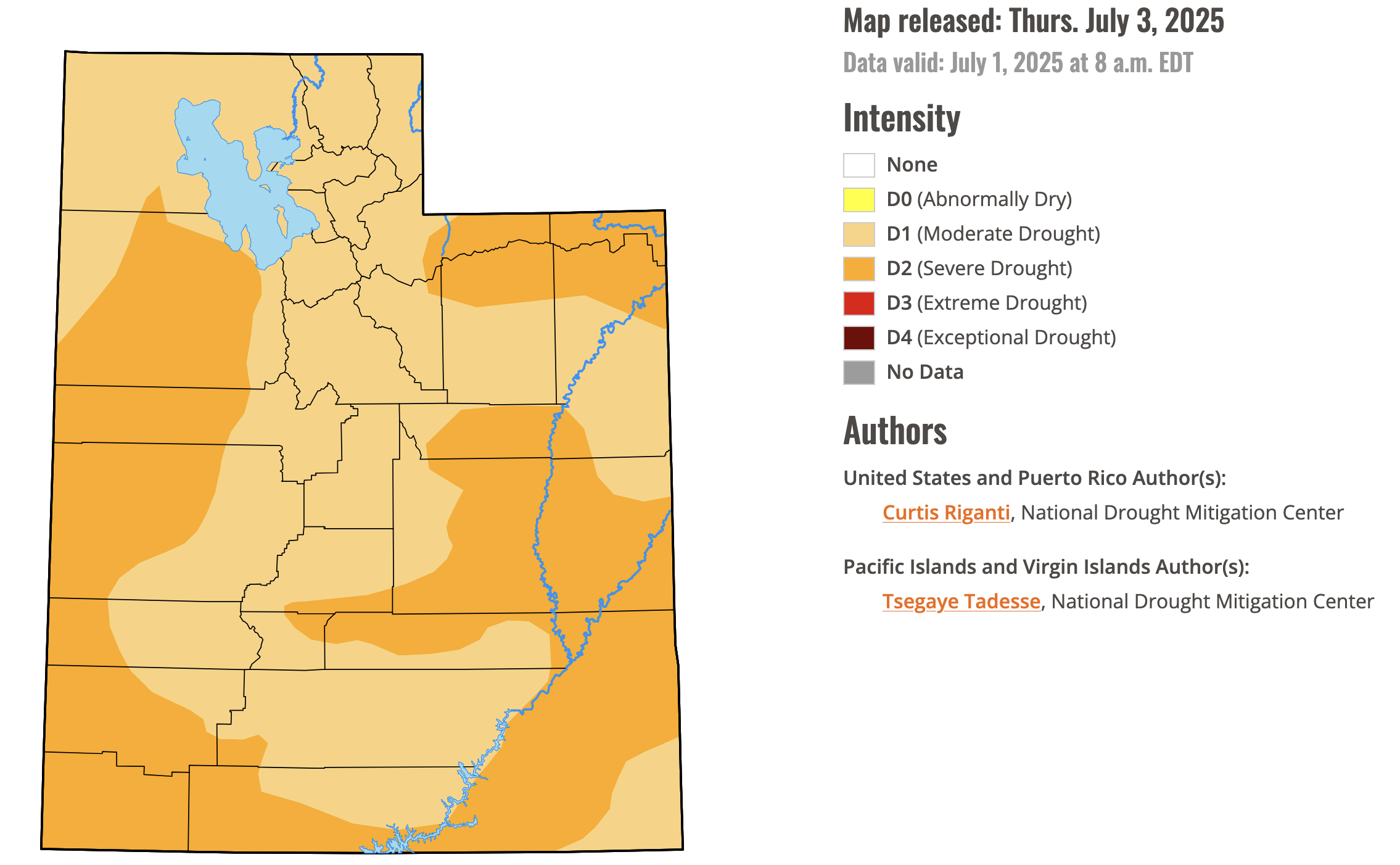 Utah’s drought map as of July 3, 2025. All of Utah is experiencing moderate to severe drought.